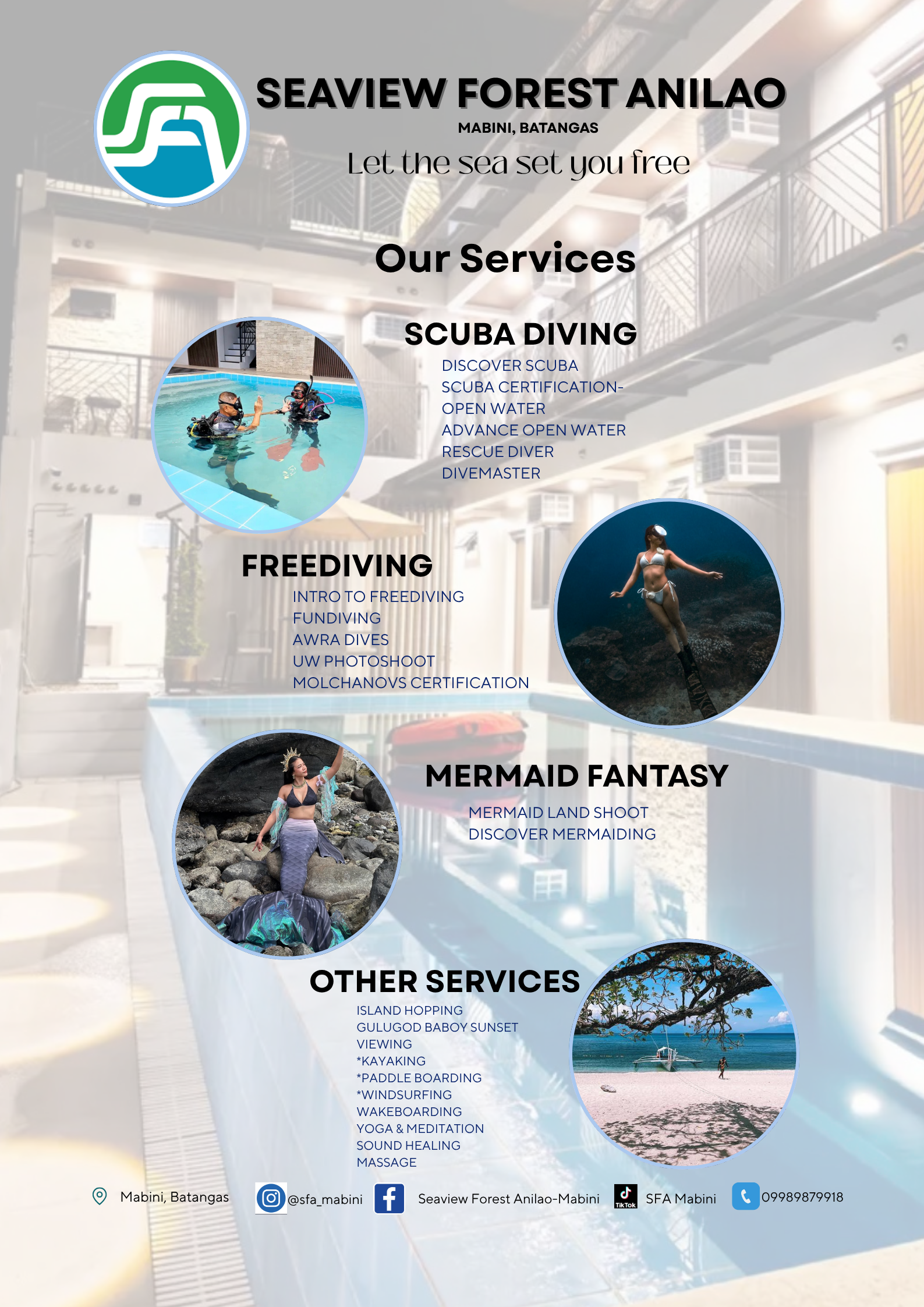 Step into the realm of comfortable living in the tropics - a paradise where an abundance of life is firmly rooted into the ground and in the waters surrounding Seaview Forest, offering a unique experience defined by the organic charm of the forest and the magic of the calming waters of the sea. The entire SFA facility, including the rooms, provide a safe, pleasant, and comfy place for relaxation, featuring a rooftop with a spectacular view of the ocean, rooms with modern amenities, and a training pool for students of free diving and scuba diving.